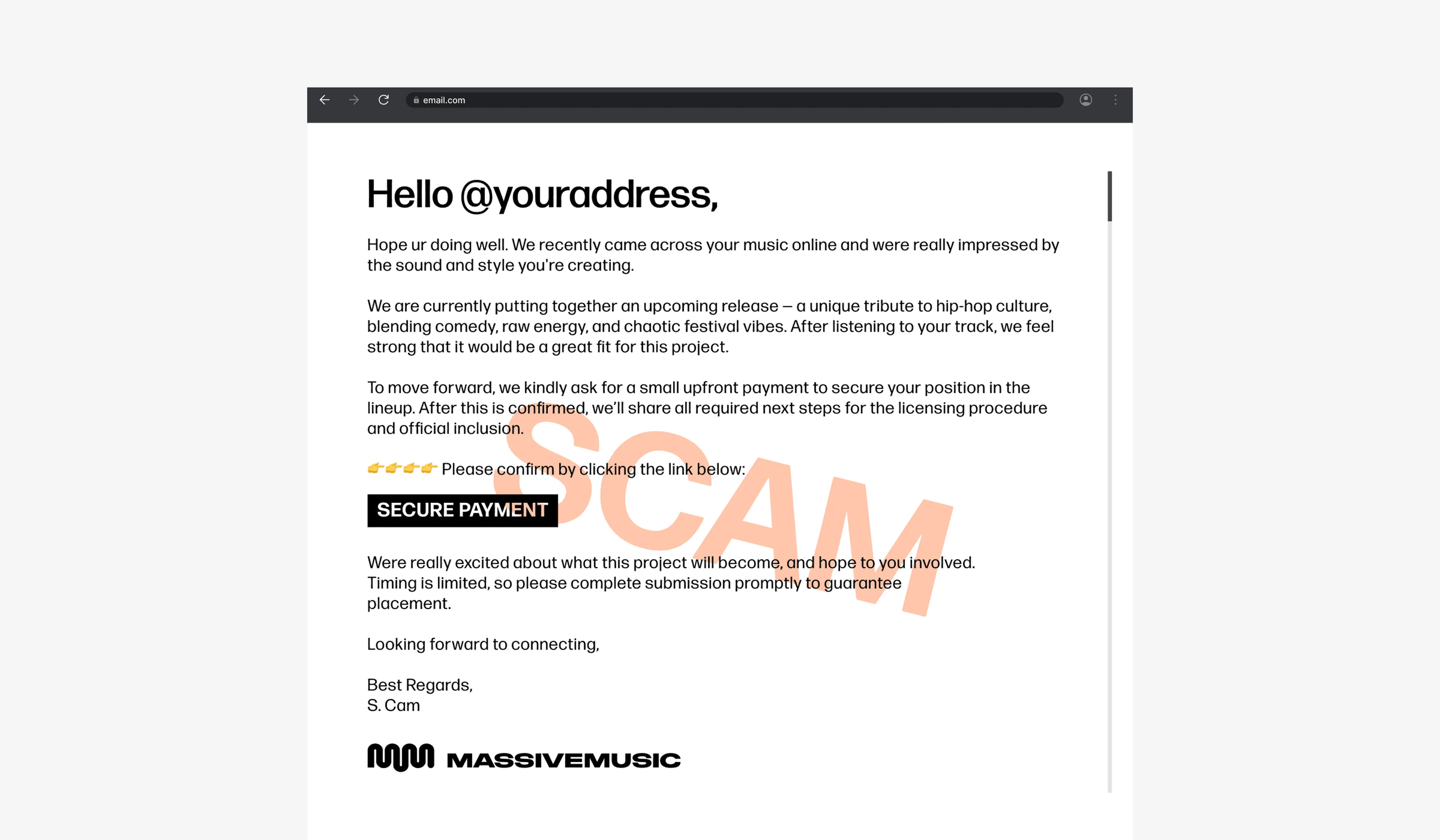 Scam: free email services (licensing.massivemusic@gmail.com) or altered domains (name@syncmassivemusic.com)