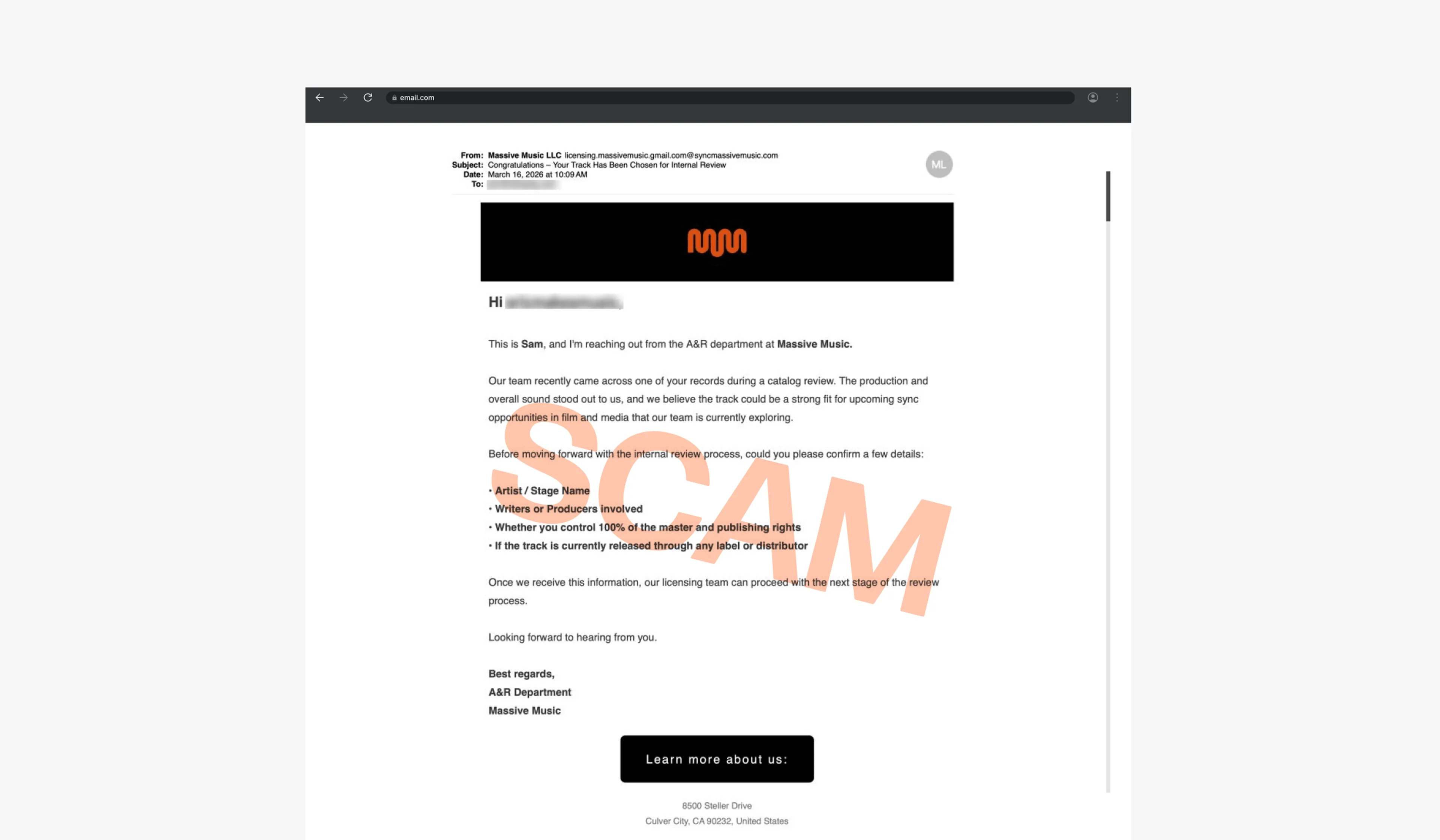 A: Check the full sender email, not just the display name. Be weary of emails from free email service accounts (e.g. Gmail, Hotmail, Outlook) or extended domains instead of verified company domains like @massivemusic.com, @bandcamp.com or @songtradr.com.